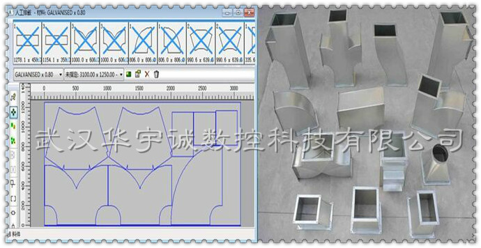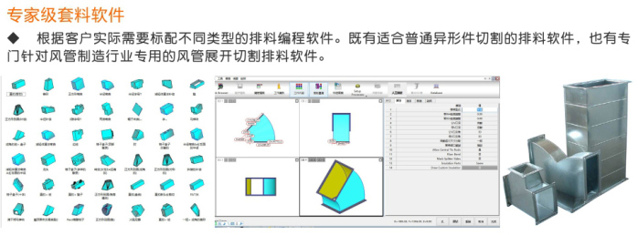 武漢華宇誠數(shù)控生產(chǎn)的通風管道數(shù)控等離子切割機,針對風管展開切割進行了專門優(yōu)化。切割速度更快、切割精度更高、切割效果更好。并搭配專門的風管展開軟件,用戶只需選擇要切割的風管類型,輸入相應尺寸參數(shù),便可自動排料、自動生成加工程序,用戶直接用U盤在切割機上調(diào)入加工程序切割即可。