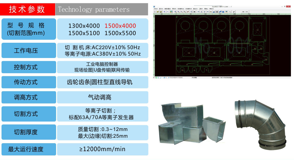 特別針對通風管道行業(yè)專門用于切割2mm以下的薄、中碳鋼板、 不銹鋼板、鋁板、銅板、鍍鋅板、白鐵皮、合金板等多種板材材料,快速風管等離子切割機,效果佳、無掛渣和毛刺;在使用時直接連接普通配置的臺式電腦,運用文泰軟件或AutoCAD繪圖軟件直接用于繪制圖形,不需轉(zhuǎn)換,直接切割,并可進行簡單的排料,工件共邊設置,購買本公司此款設備可享受免費送貨上門、安裝調(diào)試及培訓、包教包會!